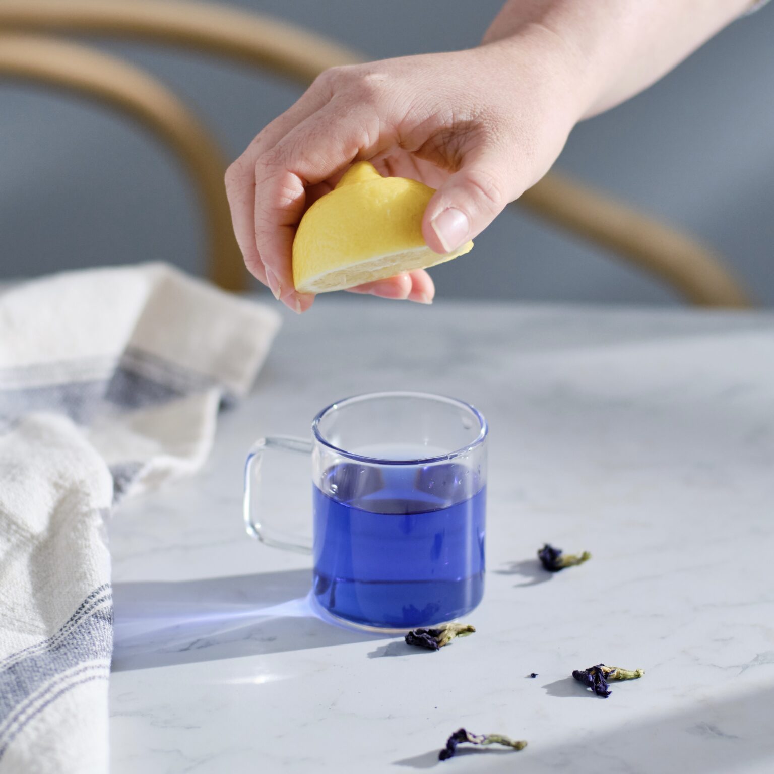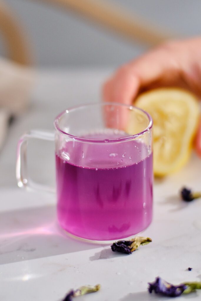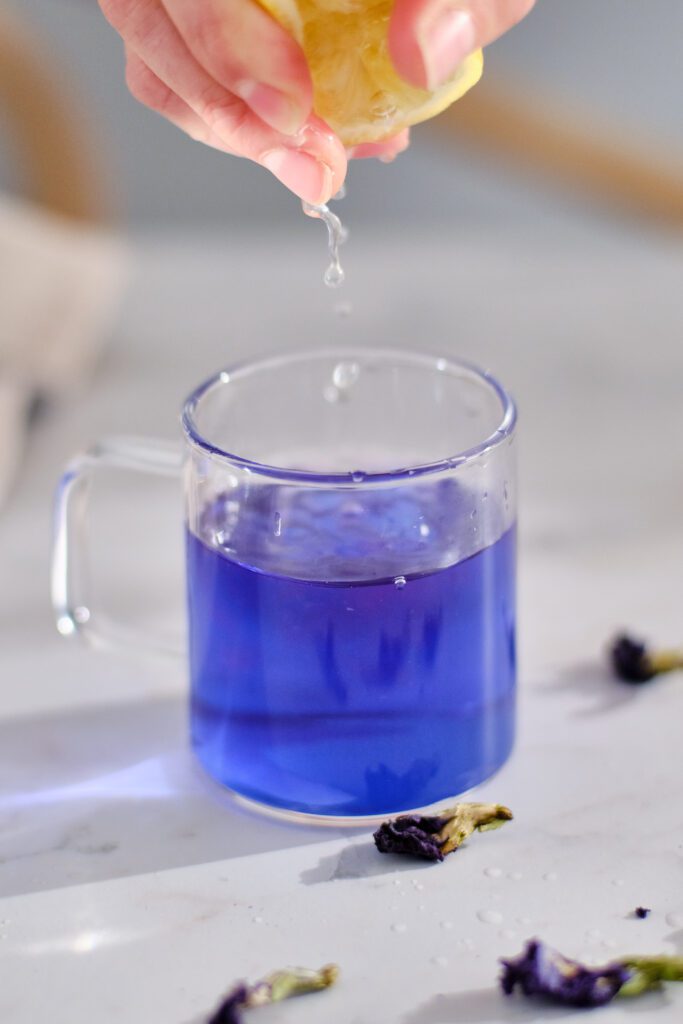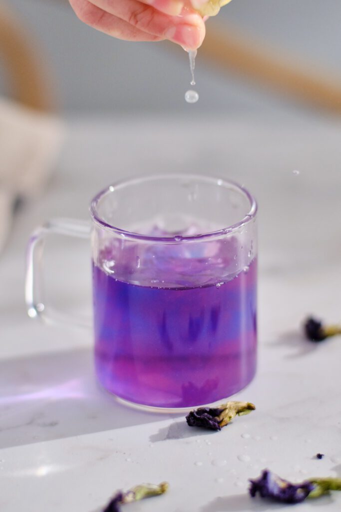 Watch the tea shift from blue to purple when lemon juice is added. Use this transformation as a symbolic ritual for personal growth, releasing the old and welcoming new beginnings.