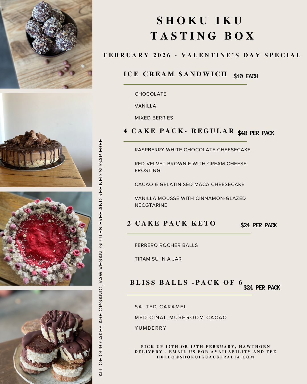 Our Tasting Box is a curated selection of our handcrafted desserts, a beautiful way to experience the essence of Shoku Iku. Each creation is raw, vegan, gluten-free, and refined sugar-free, made to nourish both body and spirit.